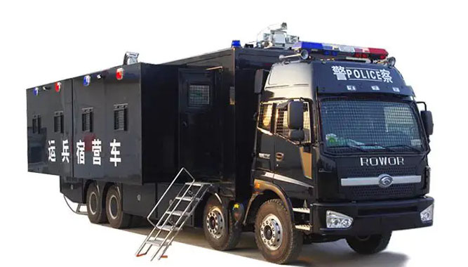宿營車是為滿足特殊環境下野外執行任務、提高后勤保障能力研制開發的專用車輛。由越野型二類底盤加裝大板式方艙組成,方艙通過液壓系統傳動、電氣系統控制實現左右兩側自動擴展。車輛配有空調和燃油暖風機,可保證方艙內的溫度恒定在人體最適合的溫度。車內具有能同時滿足32人的住宿空間,集住宿、運輸及影視娛樂為一體,滿足公安、部隊處理突發性任務的快速機動需要。具有功能齊全、性能優良、操作簡便、保障能力強、適應性廣等特點。
