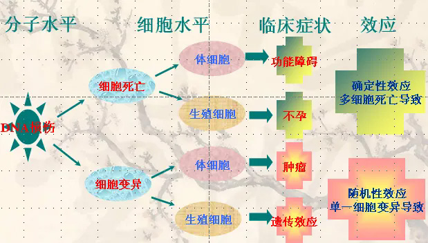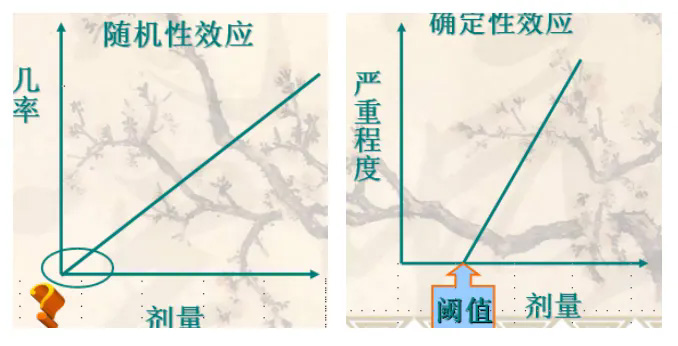 1.隨機(jī)性效應(yīng):無(wú)劑量閾值有害效應(yīng)的嚴(yán)重程度與受照劑量大小無(wú)關(guān),任何微小的劑量也可引起效應(yīng),只是發(fā)生的幾率極其微小而已。如:致癌效應(yīng)(癌癥 、白血病) ; 遺傳效應(yīng)(損傷發(fā)生在具有遺傳信息的功能細(xì)胞上,發(fā)生的效應(yīng)將顯現(xiàn)在受照者的后代身上)。