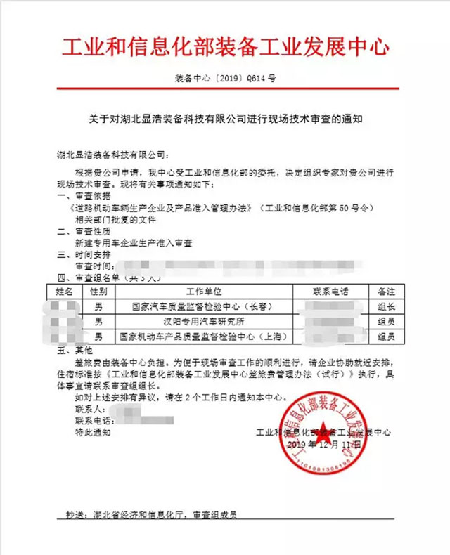 2019年12月19日湖北省顯浩裝備科技有限公司迎來了工信部委派的三位技術審查專家,三位專家對顯浩申請的專用車企業準入進行現場技術審查。依據《道路機動車輛生產企業及產品準入管理辦法》(工業和信息化部第50號令)經過三天的嚴格審查。專家對顯浩在送血車、檢測車、監測車、冷藏車等專用車的研發、生產、銷售、售后服務等能力方面給予高度認可,并一次性通過了現場審查。隨后將審查情況及材料匯報國家工信部專家組審查。