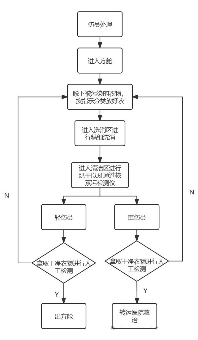 傷員處理->進入核化污染洗消車->脫下被污染的全身衣物->按分類放好衣服物品->在洗消區進行精細洗消->進入清潔區進行烘干跟核污染素檢測->(輕傷員拿干凈衣服進行檢查->出洗消車)->(重傷人員拿干凈衣服進行檢查->轉運到醫院救治)