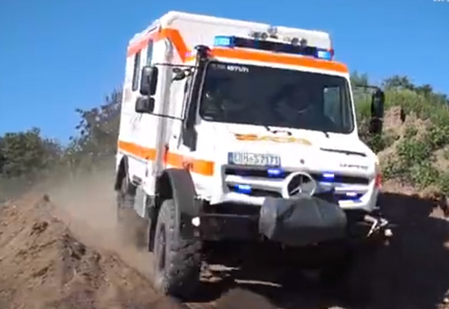 Mercedes Unimog U 4023,德國制造的堅固可靠的車輛??梢詾槠h地區的人提供醫療服務,車輛長6米,總重量為10.3噸。配備了自恢復絞盤輪胎充氣系統。發動機功率為231馬力,最高時速是89公里每小時??梢源┰缴稚矫}等困難的地形。也可以穿越水深1.2米的區域。