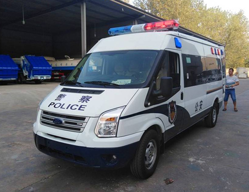 六專”包括專用囚車、羈押通道、電梯、座椅、車庫、衛生間;“四室”包括羈押室、槍彈室、裝備室、監控室。依照人民法院“六專四室”建設規范,參考GA702-2007囚車標準,囚車采用使用高強度型材制作,駕駛艙與押解倉之間的設置應急通道,應急通道門在駕駛艙一側安裝單項啟閉裝置。囚車攝像監控系統對囚室及車周邊進行全方位監控,攝像資料可進行實時顯示、存貯、備份儲存時間不低于72小時。車體前后配置加強型保險杠。后排座椅配置頭枕,押解艙無尖銳凸出物、座椅配置兩點式安全帶,固定裝置,艙體地面面配置腳撩固定裝置車頂前方安裝長排燈,車內儀表臺中間安裝警示器。囚車車身兩側上部各安裝紅、蘭方形LED燈各1盞。整車內部空間除駕駛區外,分為押運監控區、囚室等功能區域。押運監控區與囚室之間裝有前開門相通,在門內側安裝有機玻璃。在車內各區配裝有足夠的照明燈具,以滿足夜間押運時,照明的需求。設計采用 (7-17座)客車底盤,以人性化押運為核心,并融入現代化通訊技術。囚車整車集安全警示系統、實時圖像監控、加強防護系統等功能于一體的多功能警用特種車。囚車整車科技含量高,工藝精細,是法院等部門必備裝備。
