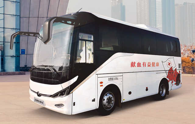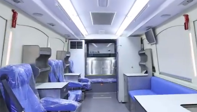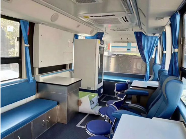 配置鋰電池系統的9米長的采血車,取消了傳統發動機的供電用鋰電池完全代替。可以滿足一天8小時的采血工作需求,鋰電池放置在下面的行李艙里面。后面這個就是整個的一個電池塊。大概有60度的電。內飾進行了升級,包括它的風道,頂棚,包層柱都做了一個商務改造。車廂的布局符合獻血流程。采血區域一共有四個采血位,可以四個人同時采血。旁邊是登記跟初篩的工作臺。負責給采血的人進行登記。檢測血型,做簡單的初篩。