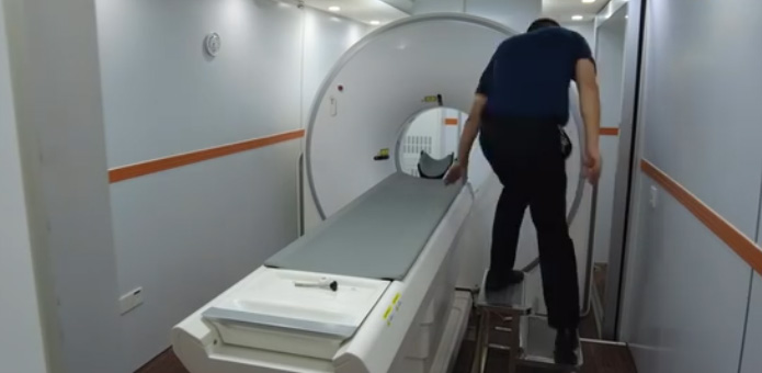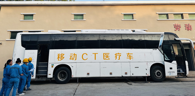 移動CT體檢車開機檢查階段,打開空調外機艙門,確保正常散熱,打開車里面的所有燈。然后打開空調,調到制冷模式,把溫度調到20度左右。然后按車控電源開關,然后打開儲能輸出開關,打開滑移艙。長按伸縮按鍵,待滑移艙完全打開就可以了。固定滑移艙踏板,不要超過邊緣處。放下固定插梢,勾住背面的拉環,輕輕的往下放,松開CT檢查床固定裝置。檢查床為可正常推動狀態。擺放輔助樓梯,打開機架開關,機架開關在CT左側處,啟動架子開關后設備電腦將自動開啟。輸入電腦賬號密碼登陸,關閉防護門警示燈工作狀態。調整檢查床位置,通過操控臺移動檢查床。進行球管預熱階段,選擇日常維護狀態。點擊球管根據界面提示完成球管預熱,進行空氣校準階段,根據界面提示完成空氣校準。進入掃描階段,錄入受檢人員信息,并且確認受檢部位。引導受檢人躺下檢查,待躺好后,調整檢查床。定位好后歸零。通過遙控臺發出指令,選擇定位。完成拍片工作,
