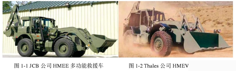 當今世界范圍內,英美日澳等發達國家研制的多功能緊急救援車處于業內較為領先的地位,其中較為典型的如圖1所示英國JCB公司為美軍設計開發的HMEE(High Mobility Engineer Excavator),是一種高機動多功能挖掘機,該機型一般用于戰場挖掘任務和戰場救援,能夠配備液壓錘、鏟斗、挖斗等作業工具,底盤系統采用多模式空氣懸掛系統,可保證高速行駛平順性和正常作業;采用全輪驅動能夠應對各種復雜地形,具有全輪轉向/蟹行轉向功能,為避免車輛喪失機動性,車輛利用高強度輪胎,能在面積狹小的場合實施作業,能夠由飛機進行遠距離運輸以實現快速移動。另外,澳大利亞 Thales 公司為美軍設計的 HMEV(High Mobility Engineering vehicle)與 HMEE 相類似,如圖 2 所示,同為較典型的高機動多功能緊急救援車