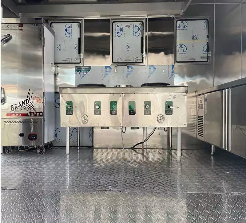 4)配電系統:餐車的設備很多,灶具及蒸箱,冰箱冰柜,熱水器、車體電瓶充電系統等配套設備,作業的電力需求大,餐車根據不同設備功率配有獨立的配電箱,配有專門的市電接入口,也可選配柴油發電機組。