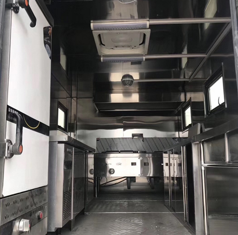 餐車裝備有主食灶,冷凍柜,炒菜灶,蒸飯設備,燉菜灶,抽油煙機,凈水儲水設備等廚房煮飯設備,用于野外炊事使用。側面為裙邊結構,后部防護焊接連接, 結合保障餐車實際情況,車內分為煮食區、洗滌區,切菜區,蒸飯區,冷凍冰柜,車輛箱體中部為烹飪區,可以容納兩名廚師作業;適宜野外作業,適應各種特殊環境,普通公路,崎嶇山路,泥沙路燈。