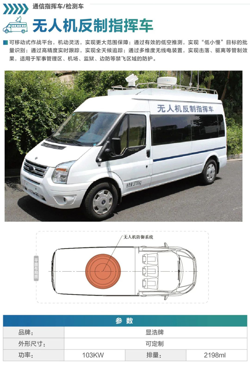 無人機(jī)反制車可移動式作戰(zhàn)平臺,機(jī)動靈活,實(shí)現(xiàn)更大范圍保障;通過有效的低空推測,實(shí)現(xiàn)“低小慢”目標(biāo)的批量識別;通過高精度實(shí)時跟蹤,實(shí)現(xiàn)全天候追蹤;通過多維度無線電裝置,無人機(jī)反制車實(shí)現(xiàn)擊落、驅(qū)離等管制效果,適用于軍事管理區(qū)、機(jī)場、監(jiān)獄、邊防等禁飛區(qū)域的防護(hù)。