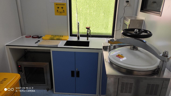 除了各實驗室的紫外線消毒車外,顯浩PCR實驗室設有一個專門的消殺區,該區域配有一臺高壓滅菌鍋,可以對實驗器材,個人物品等進行高壓殺菌滅毒。