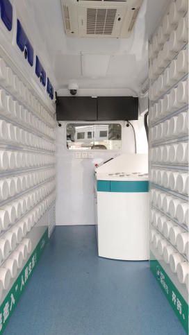 移動中藥房車車廂頂部安裝LED滾動屏,顯示接口與發藥設備對接,顯示所發藥品名稱。頂部還安裝紫外燈以便對整個車廂進行殺菌。車輛有GPS,車內提供5G(含4G)網絡連接。配置了駐車空調和行車空調,以便停車熄火時為車廂內提供溫濕度調節。