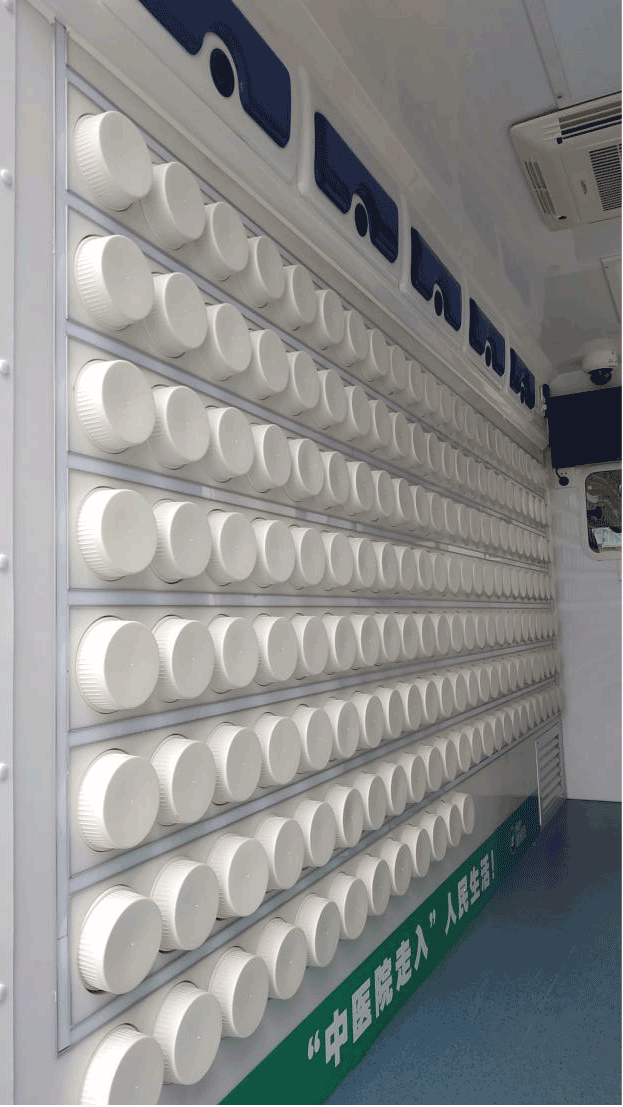 該款移動中藥房車可搭載麻黃、細辛、生姜、葛根、菊花、丹皮、青蒿、生地等上百種中藥,車內即可實現快速智能配藥。當配藥醫護拿到藥方,找到所需要中藥,放入自動發藥機中,數分鐘就可以完成藥物發放。
