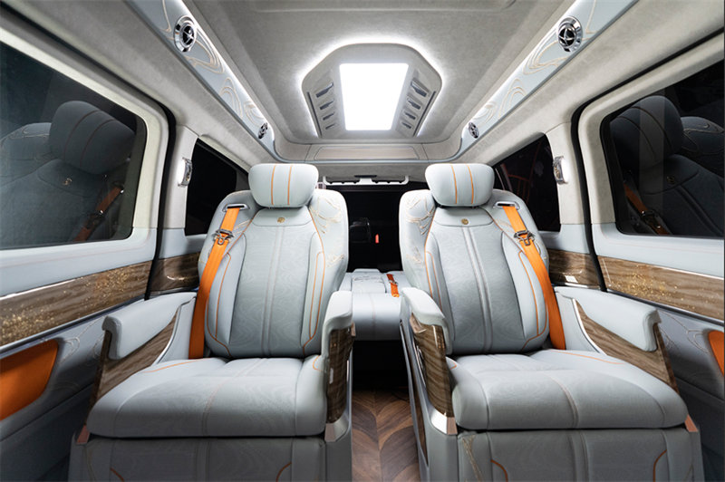 前排保留原車質感同時,加入全新設計語言,簡約現代與中式美學相結合,雙色搭配,更顯高級感,主副駕駛座椅采用納帕包覆,直接提升整車質感,還可提升舒適度,讓主副駕駛位,都能有一個尊貴體驗改裝商務車的質感、觸感雙升級,十分明顯商務接待、長途旅行都能享受視覺與觸覺的“心靈棲息”